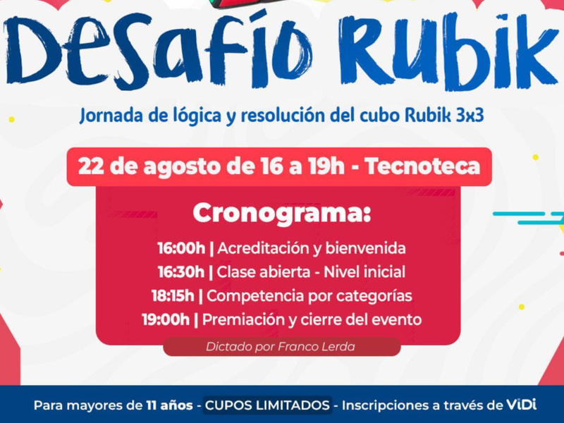 Los cupos son limitados y las inscripciones se realizan a través de la plataforma ViDi en https://vidi.villamaria.gob.ar/guia/es-AR/#/tramites/129 o buscando “Desafio Rubik”.